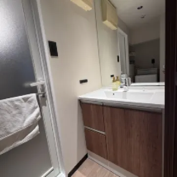 Он расположен не близко к станции метро, но рядом есть несколько магазинов, что делает его удобным. Отсутствие стойки регистрации — это облегчение, но было холодно и безлико. Номер был полностью оборудован, и мне особенно понравилась стиральная машина с предоставленным моющим средством, что позволило мне повесить одежду на балкон на ночь. В номере были микроволновка и плита, но я не очень хорошо разбираюсь в них, как готовить. Номер был маленьким, не идеальным и немного небезопасным. Минусом было отсутствие небольшого стола и стула, что затрудняло хранение вещей. Для двоих это было нормально, но для четверых было бы слишком мало.