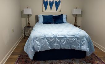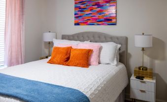 The Roxie features two bedrooms and two-and-a-half baths, with sleeping accomodations for 6 guests. Each bedroom has a queen sized bed, a smart television, and its own private bath. The bathrooms have both tub/shower combo access and come stocked with towels and a hair dryer. Did you forget your shampoo? No worries! We've got it covered.