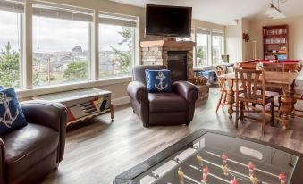 This stunning Pacific City vacation home offers two full living spaces, each featuring sunny walls of windows with spectacular views of the ocean, the river, Haystack Rock, and the charming town below. With its spacious design, Sand and Sea Beach House is perfect for large groups, extended family vacations, or getaways with friends. During the holiday season, the home is beautifully decorated with festive Christmas décor, creating a warm and cheerful atmosphere to make your stay even more special.
