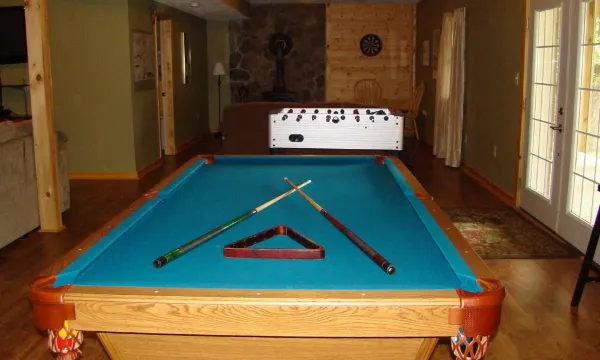 This luxurious 5 bedroom cabin loaded with amenities has something for everyone. It is equipped with satellite TVs, high speed internet. An entertainment room that has a 42” LCD TV, DVD, PS2, large movie selection, regulation size pool table, foosball, dart board, and many board games to choose from. For those that enjoying cuddling by the fire there is a free standing wood burning stove for those cool nights.