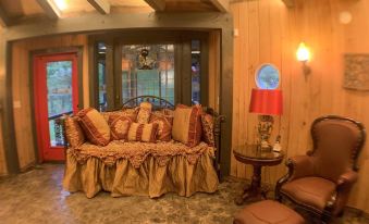 Very nice, unusual cottage. Comfortable for two or three. Well maintained inside and out. Secluded, but in a community of cabins. Other cabins are not visible from the site. Surrounded by trees and undergrowth.. Whimsical objects all around. Nice covered and screened patio, gas grill, fire pit with wood supplied. Wood stove inside. Two floors, bedroom and main bath upstairs, half bath with unique potty downstairs. Small kitchen with pretty much everything you need. Do bring trash bags and your choice of coffee and teas.