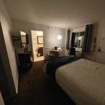 Этот мотель идеально подходит для тех, кто путешествует самостоятельно, как мы. Бесплатная парковка прямо у входа в номер, что позволяет легко забрать багаж. В номере чисто, но сантехника немного устарела, шторы немного порваны, светоизоляция средняя, нет кофемашины, а набор туалетных принадлежностей маленький и ограниченный.