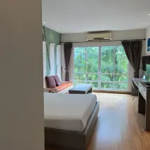 Начиная с входа, территория не была отремонтирована. Состояние довольно ветхое. Вестибюль и жилые помещения находятся очень далеко. Вам необходимо зарегистрироваться в вестибюле, а затем заехать. У парковки нет крыши. Пол - щебень. Когда идешь в комнату Приходится подниматься по лестнице, лифта нет. Ходить с пожилыми людьми, которым неудобно ходить, не рекомендуется. Номер на 2 этаже рядом с бассейном. Вода очень зеленая. играть вообще. Хороший просторный номер Но все же подтвердил, что он в очень старом состоянии. Улучшения нет. На балконе много травы и листьев. Такое ощущение, что персонал не убрал. Самое главное, кондиционер очень громкий. В праздники поеду отдохнуть и выспаться. Но нет, мне пришлось всю ночь спать и слушать звук кондиционера. Дальше ванная. Душ представлял собой ванну, но я не осмелился спать в ней из-за грязи. Более того, туалет не был чистым. Завтрака очень мало. Не стоит своих денег 😢😢😢