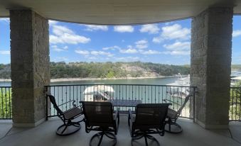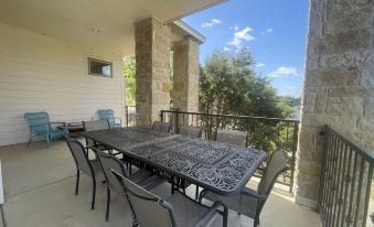 The home features 5 bedrooms & 4 full baths. Primary room has a king, guest room 1 with 2 queens, guest room 2 with a queen, and guess room 3 with a queen. The 4th bedroom is an oversized bunk room with a 2 full-size beds and 3 twins. Bunk room also has an en suite full bathroom and lots of games! 2 separate living rooms with a sectional couch in one and a sofa couch in the other - both overlooking the lake. We have several indoor and outdoor entertaining spaces available through out the property! The balconies can't be beat. Two outdoor kitchens with multiple seating areas on each level. The perfect spot to watch unparalleled sunsets. It you are lucky you will catch local wildlife across the water on the cliffs.