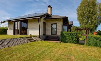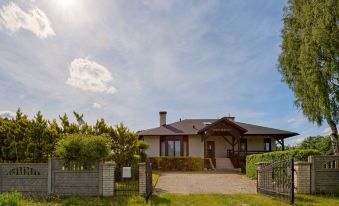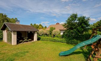 Single-family house "Trzy Brzozy". Along the wooded area, 100 m from the lake, 1 km from the beach. Private: property 1'600 m2 (fenced). Barbecue, barbecue house (swing). In the house: WiFi, washing machine, heating to be paid on the spot. Parking on the premises, single garage. Grocery 7 km, restaurant 7 km, café 500 m, bus stop 3 km, sandy beach 500 m. Riding stable 3 km, slopes 35 km. Nearby attractions: Kamięnne kregi w Węsiorach 15 km, Kościół z 1782 r. W Szymbarku 32 km, Koszałkowo-Wieżyca, Centrum Aktywnego Wypoczynku 35 km. There is also a slide with a swing for adults and children on the plot. Sandy beach by the lake and water sports equipment rental - in the "Dalmoru" recreation center 500 m away (there is a cafe - half board or full board). Rowing boat (free). Own (deep well). Deposit 1000 PLN. Access to the house via a dirt road. Kayaking nearby (June to October). 5-room house 200 m2 on 4 levels. Comfortable and stylish furnishings: entrance hall 27 m2. Living room 50 m2 with open-hearth fireplace and satellite TV. Exit to the garden. Kitchen 17 m2 (oven, dishwasher). Sep. WC. On the lower ground floor: playroom. Upper floor: 2 rooms, each room with 1 double bed. Bidet, bath/shower/WC with corner bath. Top floor: 1 room with 1 double bed and air conditioning. Open gallery with 3 beds. Oil heating (extra). Terrace furniture, deck chairs. Facilities: washing machine. Internet (WiFi). Garage (2 cars). Instead of an enclosed bedroom, some sleeping areas are located in an open-plan area (gallery, alcove, etc.). Karlowo 50