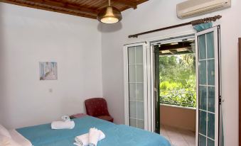 Location: The House Tonia is located above the Pelekas beach (also called Kontogialos Beach) one of the most beautiful sandy beaches of Corfu. 1.2 km from Pelekas village and 12 km from Corfu Town. On the west coast, with panoramic sea views and spectacular sunsets overlooking the Ionian Sea. The house is located on a beautiful hillside in the middle of a shady olive grove. From the House Tonia you need 100 meters on foot to reach the beach.