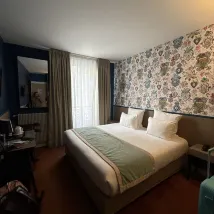 Размер номера был ожидаемым. Очень порадовало, что есть много окон и можно хорошо проветрить. Но вот чистота была так себе. Ковер и постельное белье казались пыльными и несвежими. Лифт был крошечным. А внизу, в вестибюле, постоянно витал какой-то странный, будто уксусный, запах. Две бутылки минеральной воды в номере – для Европы, наверное, это средний уровень. Рядом метро, что очень удобно. А прямо внизу расположен французский ресторан, где всегда очередь, но зато там вкусно и недорого.