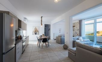 Amphitriti: This residence is consisting of a big living room with two sofas and a coffee table, a dining table and a fully equipped open plan kitchen. There are two bedrooms, one with a double bed and the other with two single beds or one king size double bed, two bathrooms and one Wc. The terrace has an outdoor sitting area at the front with built sofas and unobstructed sea view.