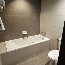 Грязная ванная комната, устаревшее оборудование, необходимо обновить, так как торшер грязный, журнальный столик поврежден, в ванной комнате на ванне и унитазе имеются следы от сигарет.