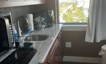 Sunrise out your windows! It is across the street from the beach but” the sand and ocean are just steps away “We were right across from where the wedding party was and the wedding so the location was perfect for us . This suite was good for 2 people .Also near some of our favorite places to eat .