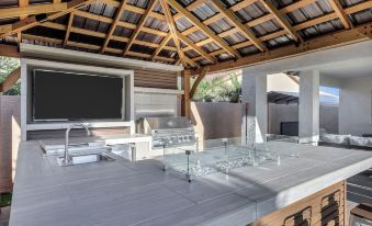 A fully-equipped gourmet kitchen lined in granite countertop is sure to inspire your inner chef. Stainless appliances include a side-by-side fridge, a gas range, and a standalone hood. The huge island offers plenty of space for meal prep. In addition, there is a Keurig coffee machine with free coffee pods, and lots of dishes/bowels/utensils, etc. When it's time to eat, gather around the six-person dining table to share your home-cooked creations. Another dining table on the patio invites alfresco meals as well as extra countertop stool chairs serving additional people.