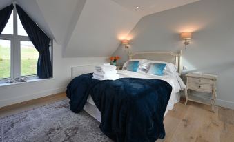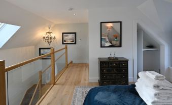 Upstairs, on the mezzanine level, there is a beautiful double bedroom featuring a Superking bed and an ensuite bathroom. Guests love details like the chandelier and cosy throws, which bring a luxurious feel to the cottage.