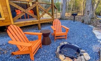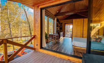 This cabin is 300 sq feet with an open floor plan (studio style) with a comfortable King bed. There is 1 full bathroom (stocked with towels, washcloths, and toiletpaper), a kitchenette with a small refrigerator, toaster, toaster oven, sink, and microwave. Dishware, glasses, silverware, basic cooking ware, over fire pots and pans, serving ware, grilling equipment, and a Keurig with a handful of K-Cups are included. A TV with a DVD player only (no television or streaming capabilities as of now) are included in the cabin. Outside you can find a hot tub, park style charcoal grill for cookouts during your stay (charcoal not included), as well as Adirondack chairs facing the creek. Wifi is NOT included in the cabin.