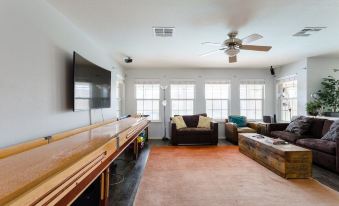 This house is a sprawling 5 bedroom house that goes on and on and on. Every square foot is tastefully decorated and set up for a comfortable stay for a group of 10 to 20+ and loaded to be the most fun house in Austin, Texas. Just take the shuffleboard table...not a puny 10 foot table...its 22 foot and handmade originally for Dave and Buster's. They said they paid $10,000 for the table when they sold it to me. We have an arcade that is an old Street Fighter game upgraded to have more than 3,000 games, a 4 player NBA Jam arcade, dual crusin car racing arcades, a Big Game Hunter arcade machine and an air hockey table in the converted game room. The pool and huge covered patio with 8 person LA Spa hot tub will be a hit. The kitchen is huge and fully loaded. The main TV is 65 inch curved 4k Samsung tv. I could go on and on! This is the house for you.