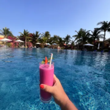 У отеля есть собственный пляж, удобно встречать рассвет. Бассейн тоже отличный, прямо рядом с ним есть бар, очень комфортно.