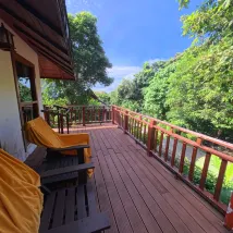Этот остров, в целом, потрясающее место. Отель расположен в самом конце Long Beach. Добраться можно либо на лодке, либо пешком, через джунгли. Отель, любезно предоставляет трансфер от Ton Sai Beach, куда приходит паром. Жили в доме №413. Живописное место, почти на вершине горы. Можно заказать еду в номер, качество приемлемое. До пляжа минут 5-7 пешком, иногда от решепшен в гору ездит машина. Пляжи чистые, вода бирюзового цвета. Рядом с отелем пляж каменистый, рядом Shark Point, левее от отеля пляж, песчаный. Самое удобное место для купания рядом с супермаркетом.