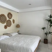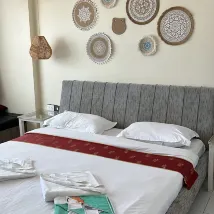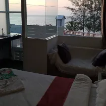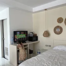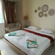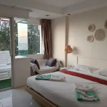 Очень близко к морю и пляжу. Я выбрала вид на море, это значит окна на дорогу (не основная трасса 😊), так что слышно как ездят байки. Вид с 4 этажа красивый. Кровать большая, бельё чистое, уборка и замена всего по запросу. Не было сушилки для белья, сначала отказали, потом пришёл мальчик, который меня заселял, и сушилка появилась. Так что приезжайте с презентами) Из минусов- кондиционер дует прямо на кровать.