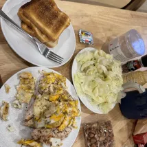 Всё новое, можно готовить. Хлеб, кофе и чай доступны в течение всего дня.
