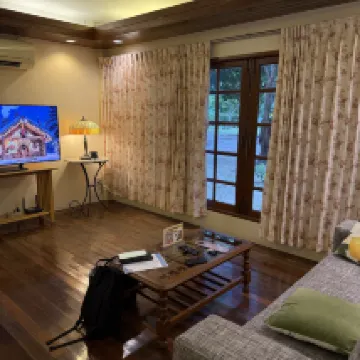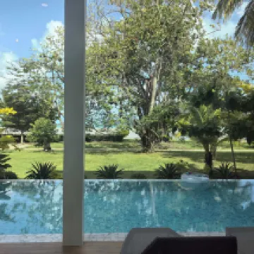 В доме три спальни. Главная спальня. В квартире две спальни с общей ванной комнатой. Ванная комната огромная. В гостиной также есть ванная комната, но душевой системы нет. В целом гигиена очень хорошая. Большие окна от пола до потолка в гостиной выходят на море. За окном — бассейн, а перед бассейном — пляж. Во время прилива создается впечатление, что бассейн соединен с уровнем моря. Поэтому вид здесь прекрасный, когда светит солнце. Рядом с бассейном растет большая кокосовая пальма. Кокосовые пальмы украшают вид за окном. Территория этого пляжного домика немного деревенская, на ней обитает большая стая гусей. Также есть белый павлин. А еще здесь много петухов, которые будут будить вас каждое утро. Каждую ночь возле виллы слышны громкие крики лягушек. В саду также обитает маленький пятнистый олень. Каждое утро во время прогулки вы можете подобрать маленькие манго, упавшие с деревьев. Он уже приготовлен и очень вкусен.