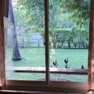 Очень интересный и невероятно красивый отель! Здесь есть возможность готовить, а во дворе можно увидеть кур, уток и лошадей. На территории отеля также живут павлины, буйволы, гуси, олени и множество других животных. Моему сыну все очень понравилось.