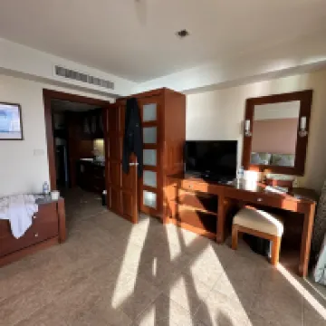 Номер оочень просторный. Первая комната как студия (гостиная совмещенная с кухней) с диванами, столиками, телевизором. Единственные окна в номере тоже в этой гостиной, выходят на бассейн. В спальне окон нет, поэтому для тех, кто любит тотальный блэкаут - подойдет 😁