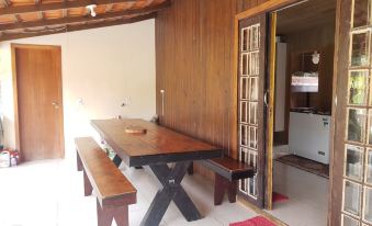Balcony with barbecue, wood burning stove and a large table with two bench seats. 19 km to Beto Carreiro Park, 6 km from Balneario Piçarras Beach and 6 km from Itajuba Barra Velha Beach.