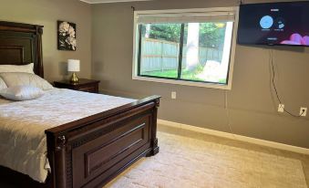Spacious Downstairs Living Areas with Cozy Seating. Our home is located in a safe, quiet neighborhood, ensuring privacy and tranquility during your stay.