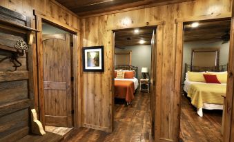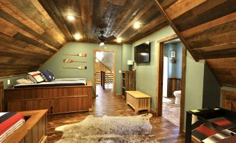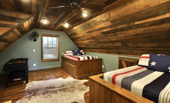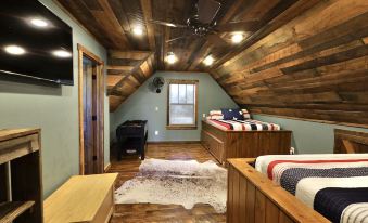 Upstairs is the loft bedroom with a tv with sliding barn door for privacy, 2 full beds over 2 full size trundle beds. In the upstairs bedroom is also a full bathroom with tub/shower combo. The bathroom has toiletries and a blow dryer. There is a cot in the attic storage for extra sleeping.