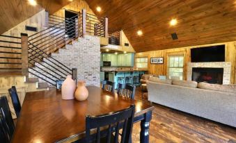Once inside, you'll see a spacious living/dining room with a tv and surround sound, one of a kind fully-equipped kitchen, and a brick accent wall leading to the staircase. The kitchen has many conveniences for your stay including: a Keurig with a variety of K-cups, a drip coffee maker, blender, microwave, crock pot, air fryer, griddle, assortment of dishes and flatware. After a long day, sit by the indoor fireplace and watch a movie or sit outside and roast marshmallows!