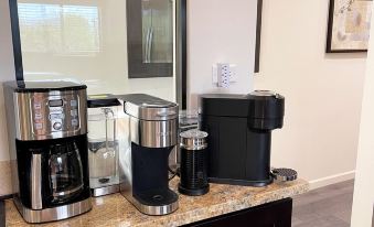 - Full size kitchen with gas stove and range, microwave, drip coffee maker, K-Cup, Nespresso and a full size refrigerator.