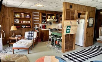 The queen bedroom is located on the lower level with a full bath. Plenty of seating along with a gas fireplace, TV with cable and believe it or not another fully stocked kitchen! Walk right out to the hot tub.