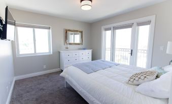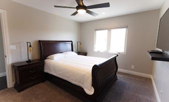 Master Suite is furnished with only the highest quality furniture and decorations, featuring a high quality Queen Bed with Novaform Mattress, Ceiling Fan and a 55" 4K Television with DirecTV. It is connected to the luxurious master bathroom which features a Custom tiled shower, dual sinks and granite counter tops.