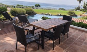 Breathtaking views! Pool and hot tub overlooking Pacific Ocean with an area to grill. Views of ocean from kitchen, living room and patio. There is a tranquil pond with fountain right in front of this patio.