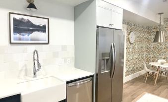 As you step into our thoughtfully designed space, you'll be greeted by a sense of modern elegance. The full-size kitchen boasts quartz countertops, a chic island, and top-of-the-line appliances, providing the ideal setting for preparing delicious meals after a day on the slopes. The spacious living room invites you to unwind in style, featuring plush furnishings and a massive 65-inch TV – the perfect spot to relax with your favorite movies or catch up on the latest ski reports.