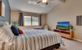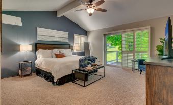 Main Floor Master Suite 1: California King bed, smart TV, en-suite bathroom with luxury tile shower. Blackout shades.