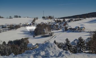 In winter, the nearby groomed trails lead through fairytale forests. Right in front of the Bergwelt begins one of the most beautiful hiking and climbing areas – the wild and romantic Schwarzwassertal valley with the excursion destination Katzenstein. In the immediate vicinity are also the Rätzteich forest pool and the Wiesenbad and Warmbad thermal baths. Only three kilometers away is Aqua Marien, Saxony’s largest water park.