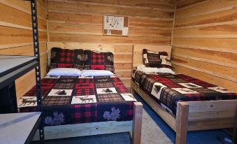 This listing is for Cabin 9 with all campground amenities. Cabin 9 is a standard rental and comes with 1 full size bed AND 1 twin bed with sheets, blankets, pillows and comforters. Also included are a floor fan, electricity, portable heater, air conditioning, concrete floors with wood walls, clothing rack with hangers, luggage storage rack, and wood ceiling.