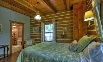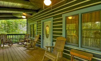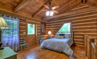 The den has a rock fireplace that stretches from the cabins first floor to the ceiling, and plush leather couches for lounging. An impressive split log fireplace leads you to the second floor loft bedroom and bathroom with its private balcony and an exterior staircase extending to the porch below. Guests who are eager to catch up on quiet and relaxation will be delighted to find the small bedroom off the loft that is the ideal spot for a peaceful afternoon nap.