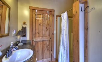 Inside your cabin, you are sure to be swept away by its simple rustic charm. The cabin has gorgeous dark hardwood floors and tasteful decor throughout. The furnishings of Sans Souci offer all the conveniences guests crave in a mountain getaway, but without exaggeration. Its the tiny details, the unique touches that set this cabin apart. The spacious first floor bedroom has a large built-in desk area, and attaches to a bath with shower and separate bathroom area. The cabin has a streamline black kitchen, and a dining area with a simple country dinette set.