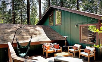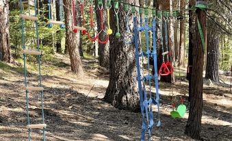 But the real magic happens right at home. Wake up to crisp forest air, unwind on the deck with a cup of coffee, and let the tranquility of nature be your daily soundtrack The backyard is an entertainment delight. Fire up the grill on the spacious deck, sway your day away on the balcony swings and deck hammock, or toast marshmallows around the firepit. Little ones will love the slackline playground, and you can challenge your friends to a game of horseshoes.
