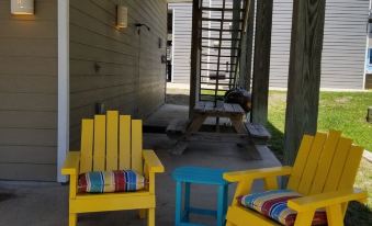 The bedroom has a king bed with a top-quality mattress, plush linens, a dresser, and a closet. Both the bedroom and living area have ceiling fans, flat-screen/smart TVs, and access to high-speed internet (WI-FI). The bathroom has a dual vanity, a large walk-in shower with a small lip for easy access, and a grab bar next to the toilet. The ramp outside of this unit adjacent to the parking area is wheelchair accessible.