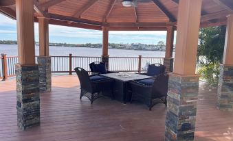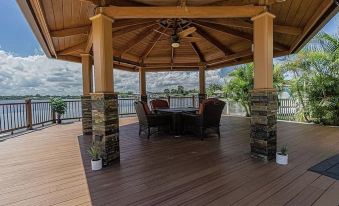 A modern home with a tropical waterfront pool is the epitome of luxury and relaxation. The tropical pool is surrounded by lush greenery, palm trees, and vibrant flowers, creating a serene oasis. A relaxing gazebo with a fire pit is the perfect blend of comfort and ambiance for outdoor living. A cozy, open-sided structure, offering shade during the day and a warm, inviting glow at night. The fire pit is an modern gas-powered feature that perfectly accents the night or morning sunrise. Surrounded with comfortable cushioned chairs and you’ve got an ideal spot for gatherings or quiet evenings. Close to all the restaurants, marina, night life and much, much more!About pets:No pets allowed.About checkOut:Check out before 10:00 AM.About children:Children allowed: ages 0-17.About checkIn:Check in after 3:00 PM.About smoking:Smoking allowed: in designated areas.About minBookingAge:Minimum age to rent: 21.About events:Events allowed: family gatherings, birthday parties, weddings.Maximum event attendees: 15.