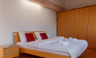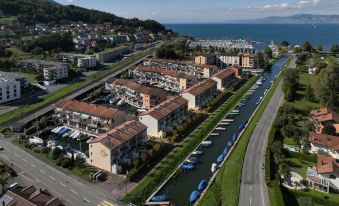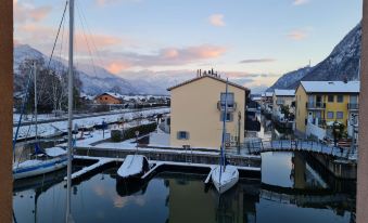 Large resort "Residenz Marina". On the outskirts, 300 m from the centre of Le Bouveret, in a quiet, sunny position, 200 m from the lake, 50 m from the canal. In the house: central heating system. Shop, grocery 800 m, restaurant, bakery 500 m, bicycle rental 190 m, bus stop "Bouveret village" 1.2 km, railway station "Le Bouveret" 300 m, pebble beach 200 m, outdoor swimming pool 300 m, indoor swimming pool 7.2 km, thermal baths 30 km, public bathing area 300 m, bathing lake "Léman" 300 m. Sports harbour 200 m, golf course (18 hole) 15 km, surf school 200 m, tennis, minigolf 12 km, walking paths from the house 300 m, mountain railway 15 km, slopes 18 km, ski school 18 km, children's ski school 35 km, sled run 29 km, cross country ski track 35 km, ice rink 18 km. Nearby attractions: Parc Aventure 17 km, Château Chillon / Fort de Chillon, Swiss Vapeur Parc 100 m, Aqua Parc 500 m. Well-known ski regions can easily be reached: Les Portes du Soleil 18 km, Villars 35 km, Leysin 31 km. Well-known lakes can easily be reached: Lac Léman. Hiking paths: Portes du Soleil. The keys‘ handover takes place by the agency Interhome in Bouveret. Neighbourhood highly sensitive to noise. Quietness and good behaviour expected. "Vasco da Gama B1/2", 2-room apartment 105 m2 on 2 levels on 2nd floor, south-east facing position. Bright, comfortable and cosy furnishings: open large living/dining room with cable TV and radio. Exit to the balcony, south-east facing position. 1 large double bedroom with 1 double bed (2 x 90 cm, length 200 cm), electric shutters. Exit to the balcony. Open kitchen (oven, dishwasher, 4 ceramic glass hob hotplates, toaster, kettle, microwave, electric coffee machine, Capsules for coffee machine (Nespresso) extra). Shower/WC. Upper floor: gallery with 2 beds (140 cm, length 200 cm), fan. Large balcony, south-east facing position, small balcony, north-west facing position. Balcony furniture. Very beautiful view of the countryside and the canal. Facilities: washing machine, dryer. Internet (WiFi, free). Parking space n 52 (roofed). Please note: non-smokers only.