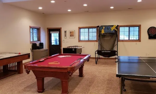 The Pool Barn inside is ONE BIG SPACE of about 1200 sq ft. It includes a full bath/shower. There is a full-size kitchen with stove/oven, refrigerator, microwave, toaster, and Keurig. The kitchen is stocked with cookware, dinnerware, and silverware. We have 5 regular queen size beds, 5 of which are set up all the time and 1 spare. It is all one big open space that in addition to the kitchen and beds also includes 2 large couches and TV, movies, stereo speakers, wifi, darts, ping pong, pool table, air hockey, foosbal, golf putting, and basketball pop a shot. The inside of the Pool Barn is all yours. It is private during your stay. Our home is a separate building on property.