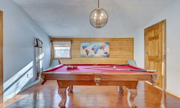 Forget your worries in this spacious and serene space. Retreat to the heart of the Poconos. Bring your family and enjoy this beautifully renovated home located on an acre of land. Get your sweat on in the Sauna! Challenge your friends to a game of pool. Board games available for family game night. Year-round fun in the Poconos. Ski at nearby trails during the winter, discover and hike the Delaware National Park, and splash around in the water parks Camelback (outdoor) or Kalahari (indoor).About pets:No pets allowed.About checkOut:Check out before 1:00 PM.About children:Children allowed: ages 0-17.About customRules:No shoes in the home and absolutely no smoking..About checkIn:Check in after 2:00 PM.About smoking:Smoking is not permitted.About minBookingAge:Minimum age to rent: 21.About events:No events allowed.
