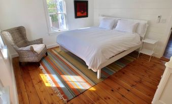 Downstairs features an open dining/ living room with cathedral, beamed ceilings, wide-plank antique pine floors, a gas fireplace and a set of double doors that open out to the enchanting garden. There is a separate dining area with a farmhouse-style dining table with seating for up to 8 people. The open kitchen has new, stainless steel appliances, plenty of counterspace and is fully equipped to prepare meals whether it be inside or grilling in the garden.