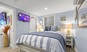 Bedroom 1 – A cozy queen bed with ample storage and coastal decor for a restful retreat.