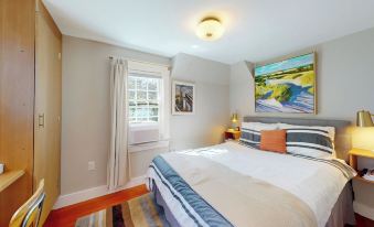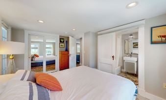 A beautiful apartment located in a Greek Revival home at 5 Cottage Street ( Norse Wall House ) in the West End. The apartment is just steps to town, restaurants and the beach, but is located in a quiet residential neighborhood surrounded by lovingly maintained homes and gardens. The apartment has two bedrooms and two bathrooms. One bedroom located on the second floor has a queen-sized bed, a private master bathroom and a separate entrance with private deck. The other bedroom located on the first floor ( *both bathrooms are on 2nd floor ) has a queen-sized bed. Both bedrooms are very private. The common bathroom has a shower and washer/dryer. The living room and kitchen have great views of Provincetown harbor, Long Point Lighthouse and the tip of the cape. The living room is large with restored mid-century sectional sofa, a desk, hidden Flat screen 40' TV with DVD/VCR. Wireless internet connection. The kitchen has a full range, large refrigerator, dishwasher and microwave. There is a large garden with marble table and PARKING avail for one car. 2nd parking space can be arranged upon request..
