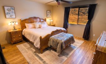 Inside, you'll enjoy a one-story, 3-bedroom, 2-bathroom, spacious living and entertaining space with plenty of seating, Wifi, smart televisions with complimentary Live TV, Netflix, and Prime Video in every room, plenty of natural light, and gorgeous mountain views. Enjoy the comfort of central heating & air conditioning, a vaulted ceiling, and wall-controlled ceiling fans.
