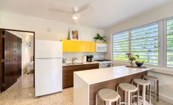 The ground floor rental unit has 2 bedrooms, 1 bathroom, a full kitchen and living room and outdoor dining that has ocean and sunset views. Air conditioning in all the bedrooms. Sleeps 4-6 people.